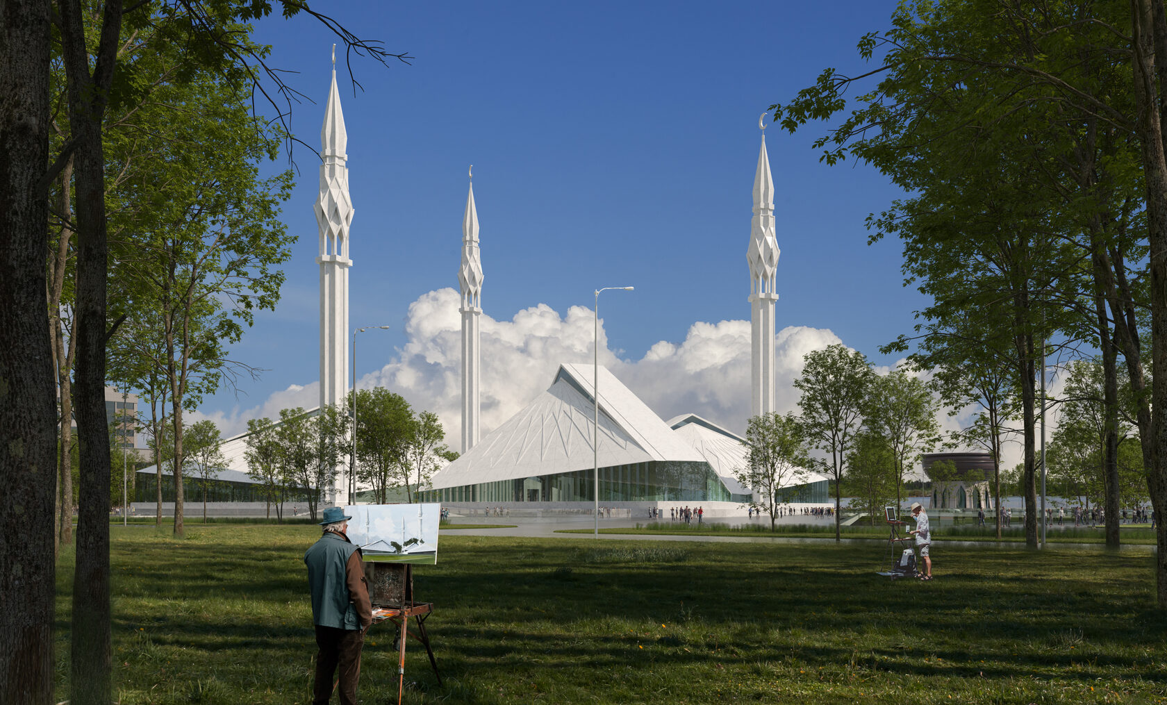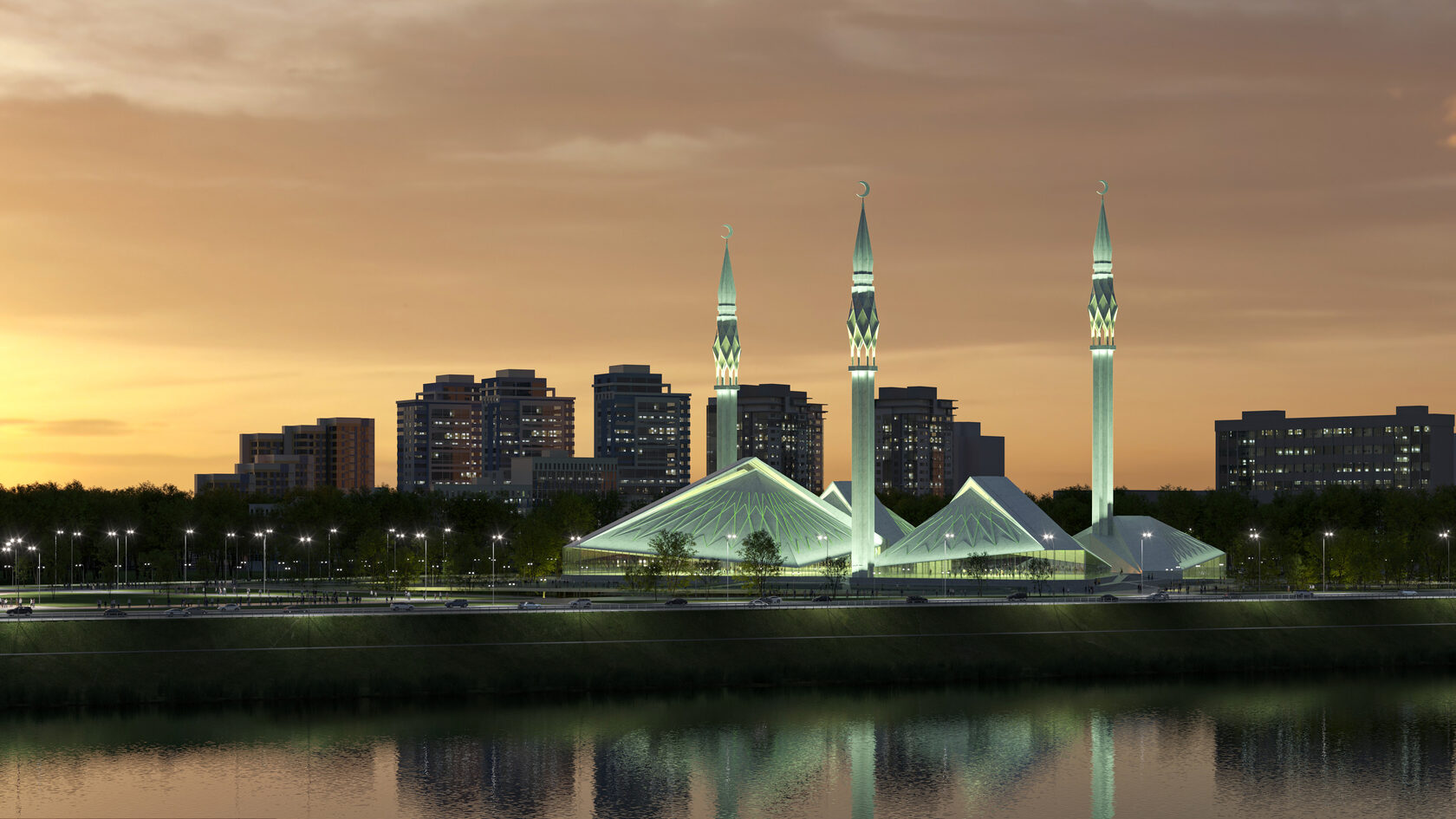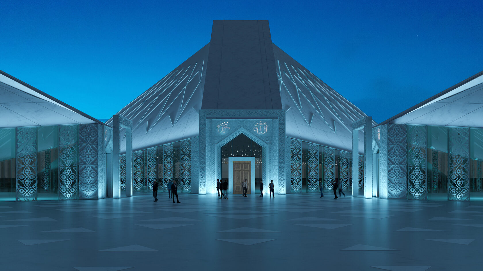 Все это, благодаря белому цвету фасадов, олицетворяющий чистоту. Круговое остекление архитектуры облегчает монолитный объем, показывая прозрачность и открытость религии Ислам. Геометрические и современные паттерны подчеркивают и улучшают детализацию объема, при этом не нагружая ее.